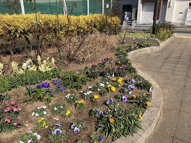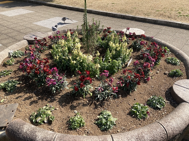 花壇の花を冬から春にかけて咲く花に植え替えました。パンジーやキンギョソウ、ストックなどが中心です。バラも咲いていますので見に来てください。