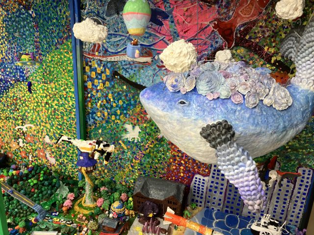 色とりどりのまちの中をよく見てみると、有名な観光地なんかも含まれていて、と思うとアニメのキャラクターが遊んでいたり、はたまたクジラが空を泳いでいたり、細かいところまで見ると発見がいっぱい!