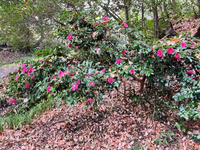 カンツバキはサザンカとヤブツバキの交雑種(雑種)で、枝が横方向に伸びるので樹高が高くならず、1m程度の低木です。