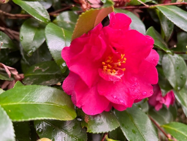 日本の固有種で、名は山茶花:サンサカが訛ったものといわれています。野生種は花弁が5枚の白花なので、道保川公園のサザンカは園芸種です。