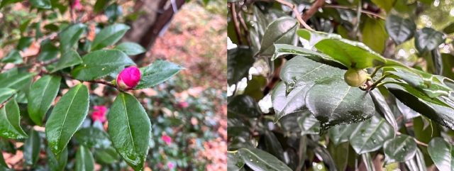 また、サザンカとカンツバキの蕾(写真左)は葉の上側に、ヤブツバキの蕾(写真右)は葉の裏側に隠れるようについています。