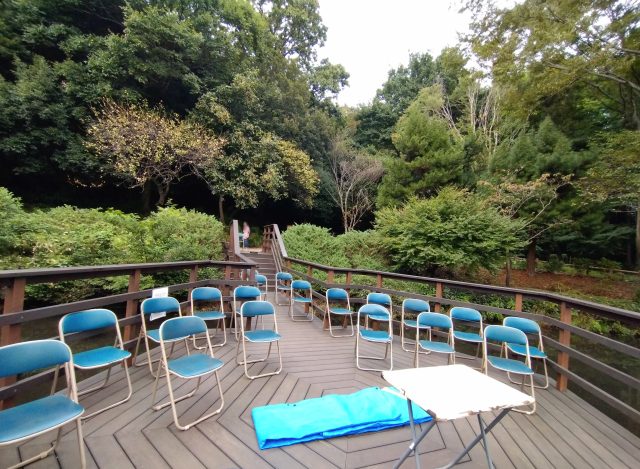 (白いテーブルのあたりに筝を置き、立って演奏します。)