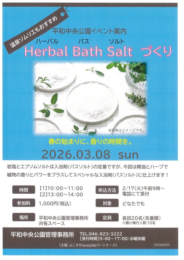 平和中央公園では3月8日(日)「Herbal Bath Saltづくり」を開催いたします。