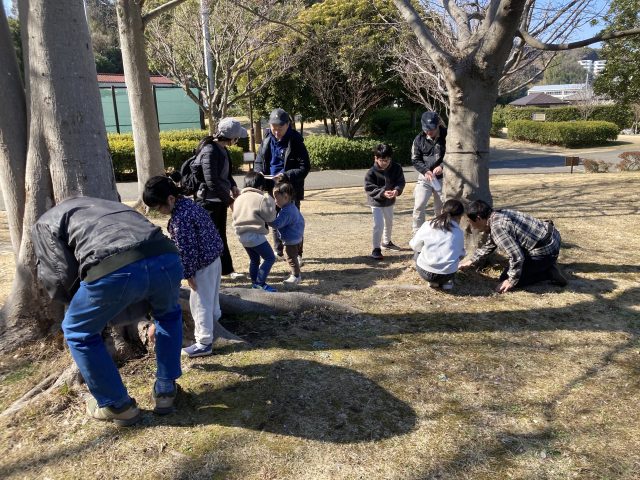 ここには、マテバシイ、スダジイ、シラカシといったどんぐりが落ちています。みんな見つけては観察し、袋に入れて、後ほどの工作に使います。