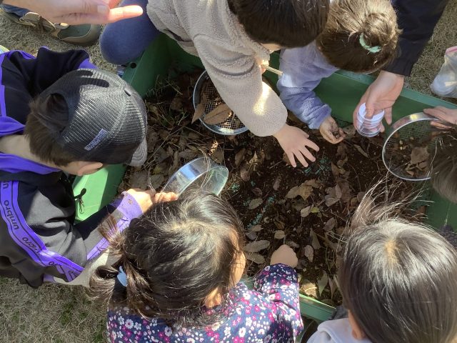 これは、環境学習の一環として、園内をめぐってどんぐりを探した後どんぐりで工作をするイベントで、今年は同時に、落葉観察と水生生物の観察も行いました。