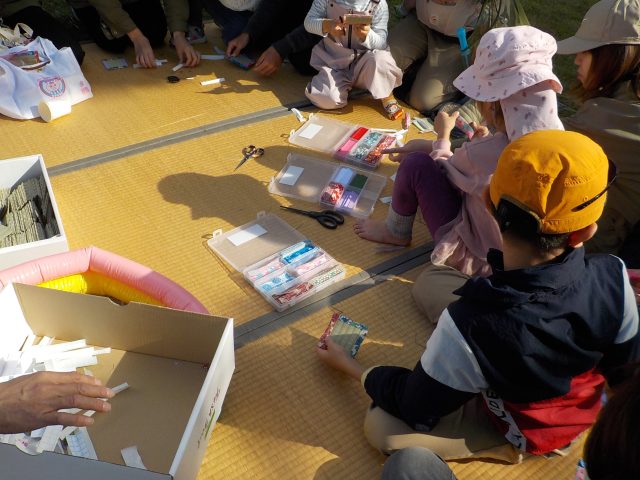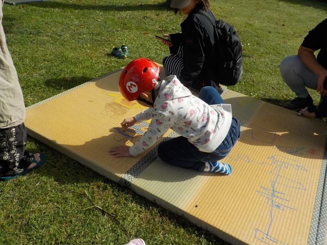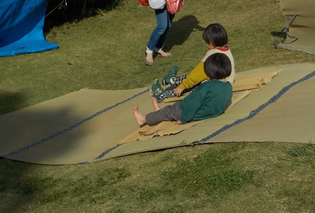 加藤畳店さんのご協力で、芝生の上にゴザを敷いて寝転んだり、畳に絵を描いたり、畳スライダーで楽しく遊びました。