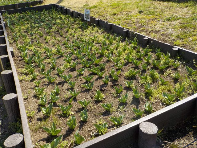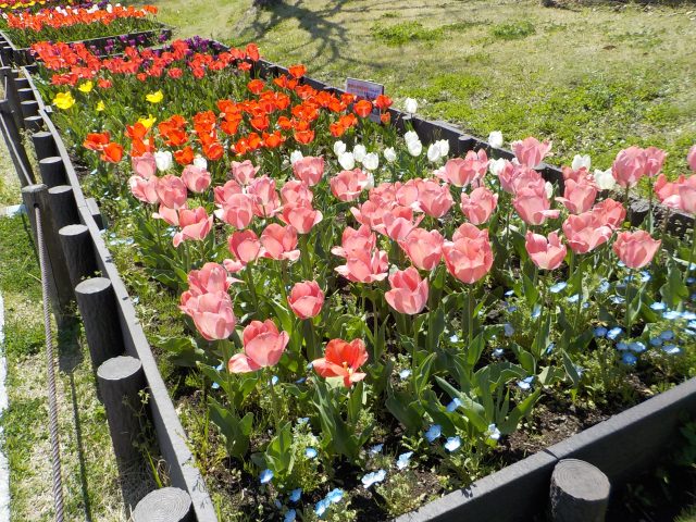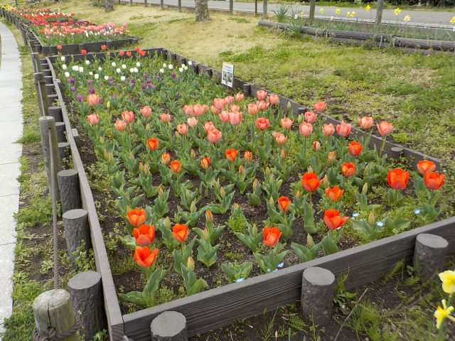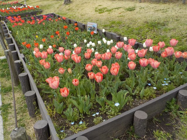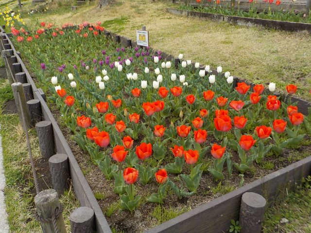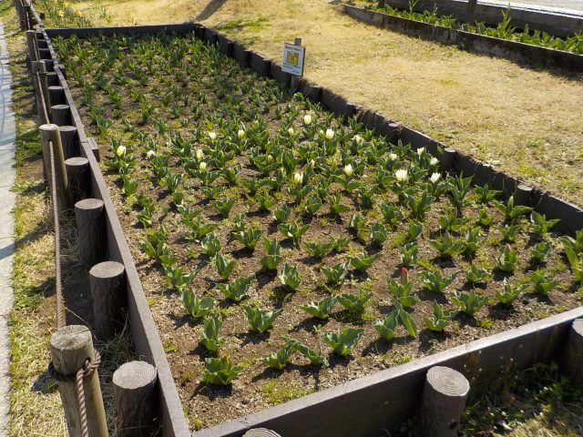 昨年12月にコスモス保育園と港南区地域子育て支援拠点『はっち』と日野小学校にご協力をいただき、球根を植えた園路花壇のチューリップが一部の色を除いて開花しています。