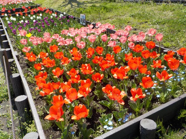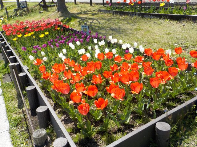 昨年12月にコスモス保育園と港南区地域子育て支援拠点『はっち』と日野小学校にご協力をいただき、球根を植えた園路花壇のチューリップが黄色以外はほぼ全て開花しています。