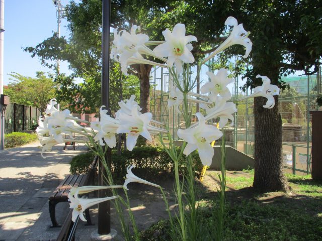 あちらこちらの植込みの中から白いテッポウユリが咲いてきています。