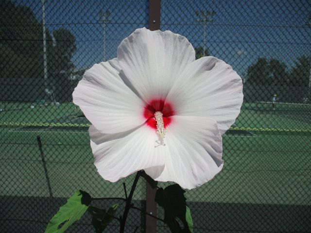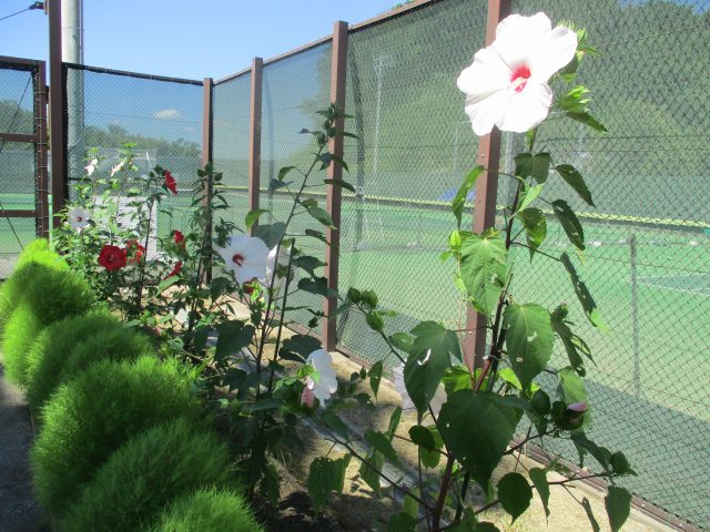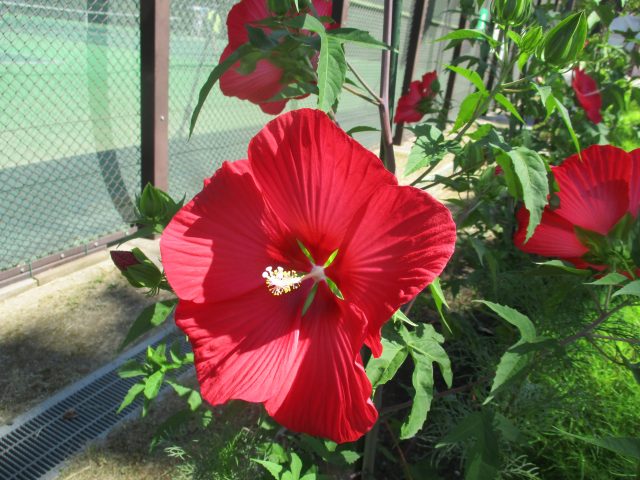 テニスコート前のタイタンビカスは、今年の6月に植栽して7月中旬頃から3か月間ずっと花を咲かせています。