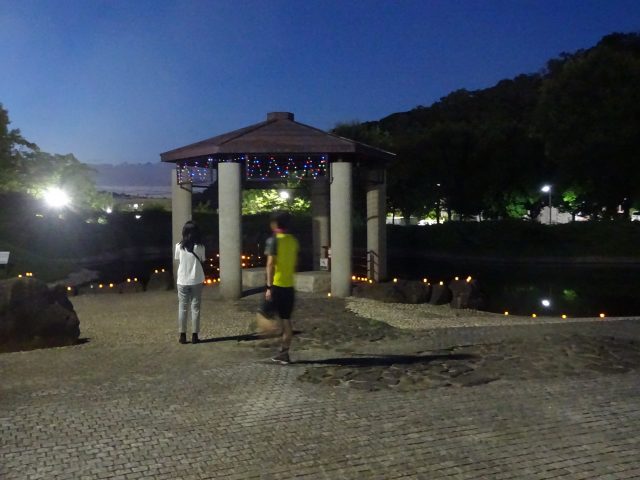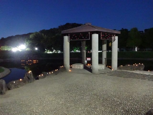8月10日(火曜)の夕方から一日限定で、池の東屋周辺をLEDライトで飾りました