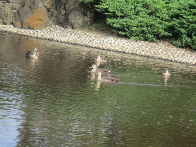 天気の良い日はカモが池を自由に泳いでいます