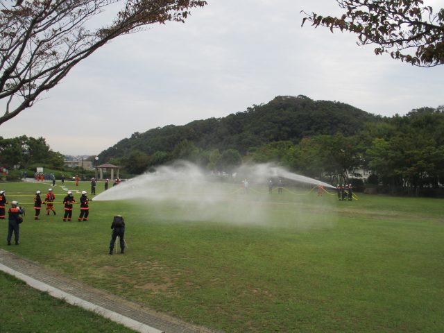 消防隊員が準備のため、芝生広場全面に散水をします。