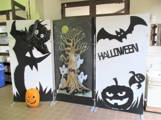 10月31日のハロウィンに向けて、レストルーム内にパネル設置と装飾を行いました!