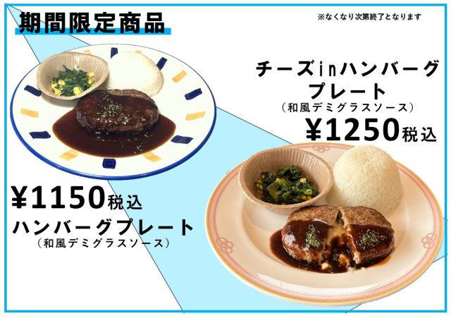 当店人気の2種類のハンバーグにかけてご提供致します。