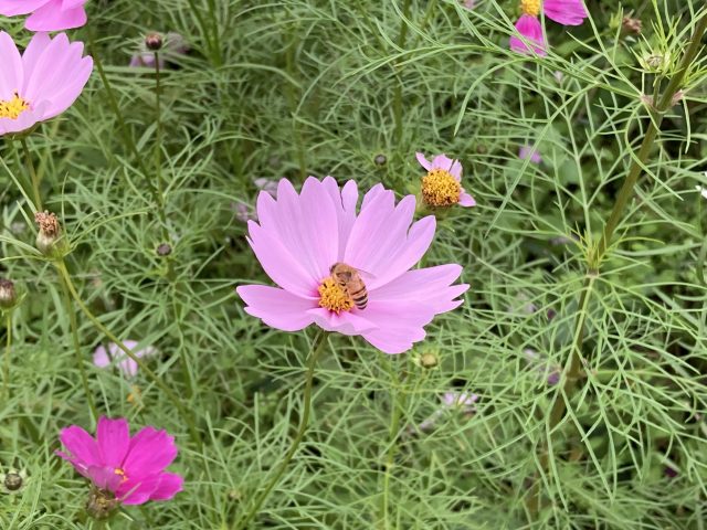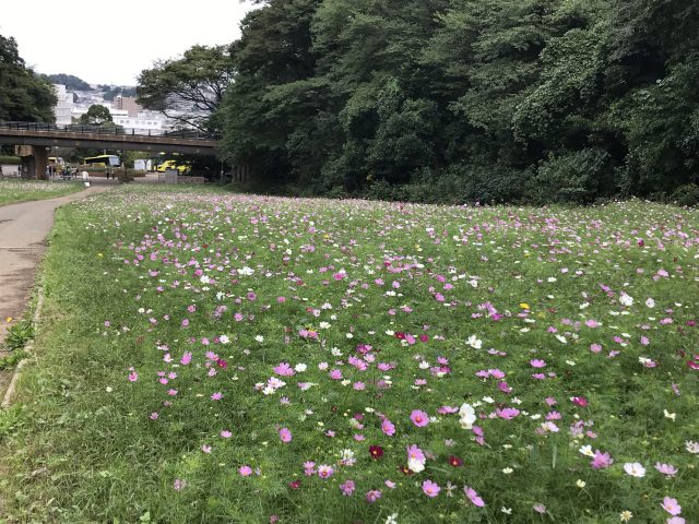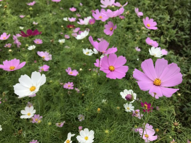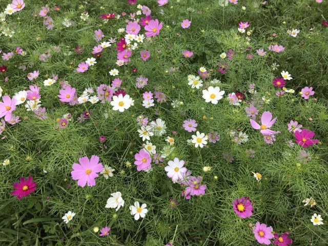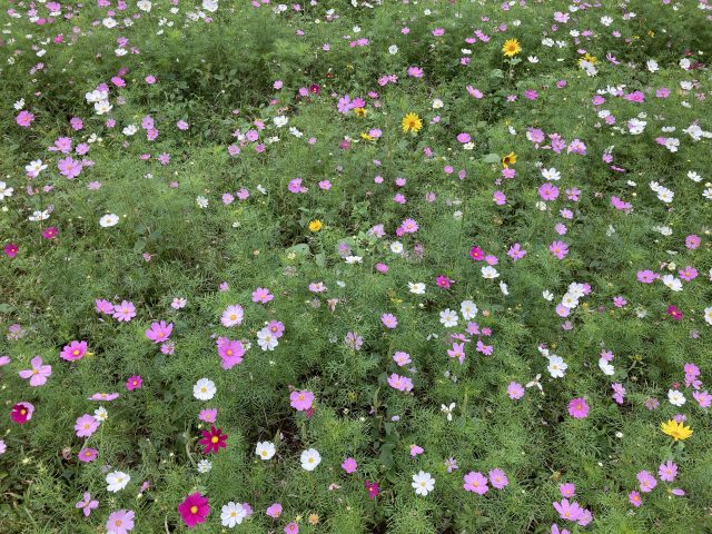 今年は夏場にヒマワリを咲かせていたこと、その後の猛暑の影響もあり、種まきの時期がかなり遅くなったため、この時期に開花となりました。また遅く撒くと、コスモスの背丈は小さくなりますので、例年より背丈は低めです。
