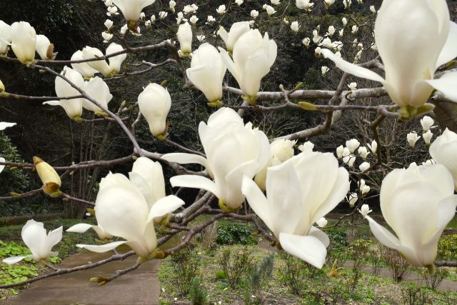 イングリッシュガーデンではハクモクレンが満開です。
