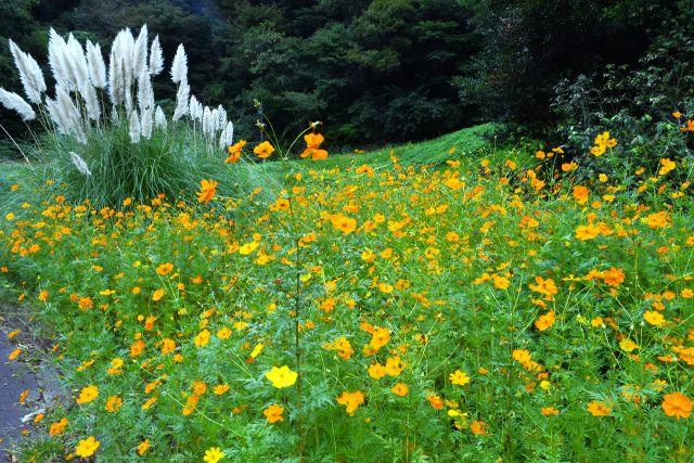 ハーブ園、天空の花畑のコスモス、センセーションが5分咲きです。