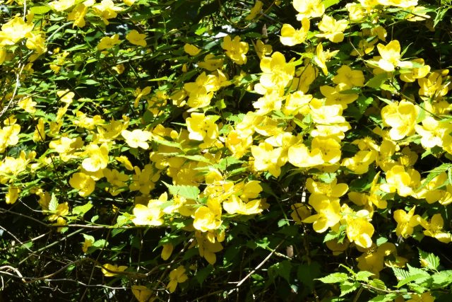 展望台下では西洋シャクナゲとヤマブキが開花中です。