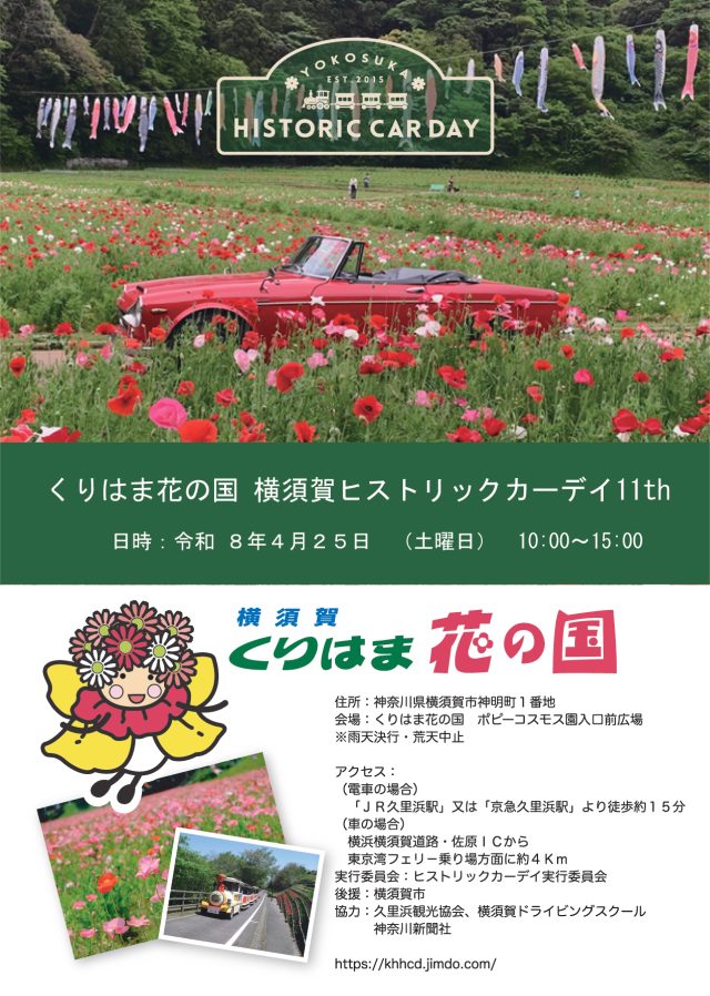 イベント情報 ヒストリックカーデイ 2026 開催予定 雨天決行 11年目の開催です。 ポピー園前広場に往年の名車が大集合! かっこいい車たちをぜひお楽しみに! 詳細データ 開催日 4月25日(土曜日) 開催時間 10:00~15:00 開催場所 ポピー園前広場 主催 横須賀ヒストリックカーデイ実行委員会 注意事項 雨天決行、荒天中止 一覧へもどる