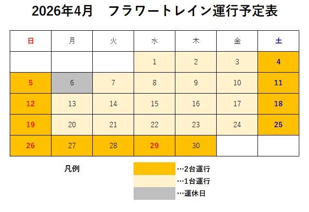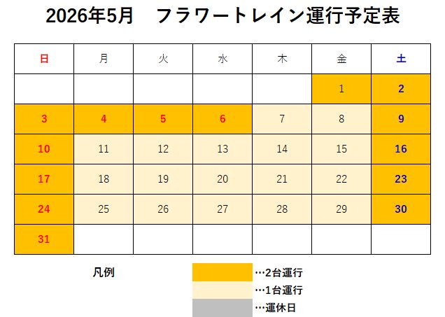 2026年4月~5月 フラワートレイン運行日及び運転ダイヤのご案内です。