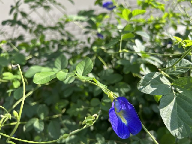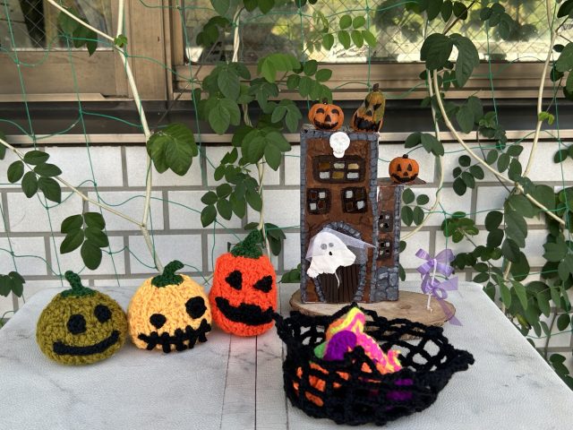 夏の暑さを遮るグリーンカーテンとして育てているバタフライピーも良い感じにツルが伸びていてハロウィンのイメージにぴったりではないでしょうか。