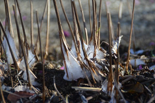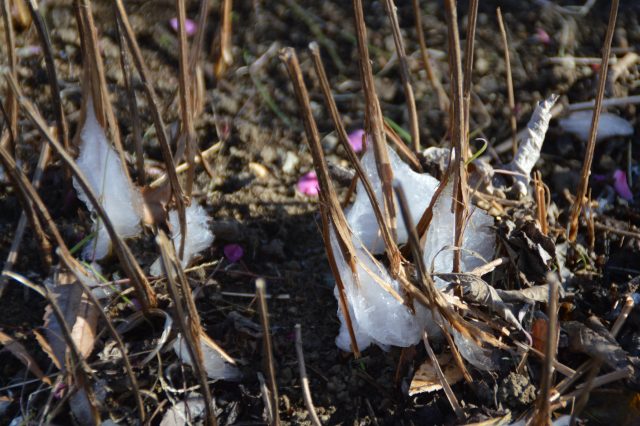 結晶は、土の中の水分が茎の中からしみ出して凍ったもので、氷点下になる場所でしか見られない現象です。