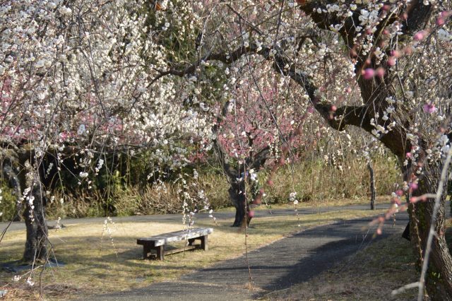 ベンチで一休みしながら梅を眺めてはいかがでしょうか♪