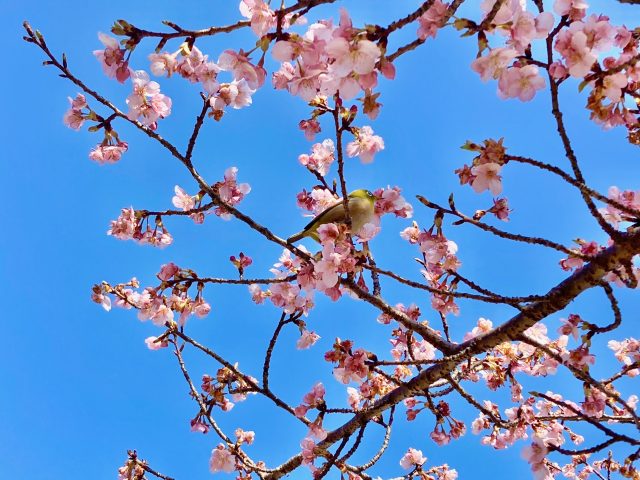 タイミングが良ければ蜜を吸いに来ている「メジロ」を間近で見ることができるかと思います。