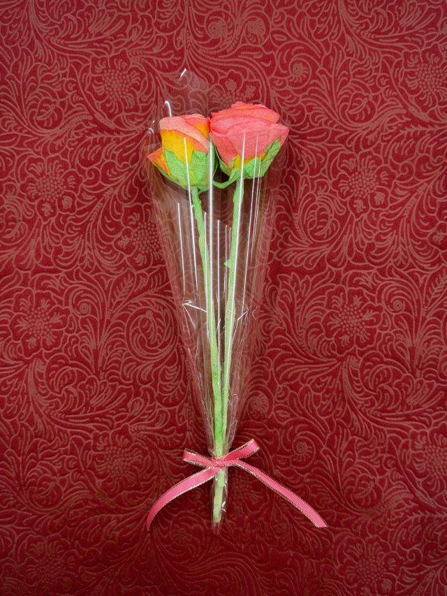 食紅で染めたキッチンペーパーを使ってバラの花を作ります。最後は可愛くラッピングします♪
