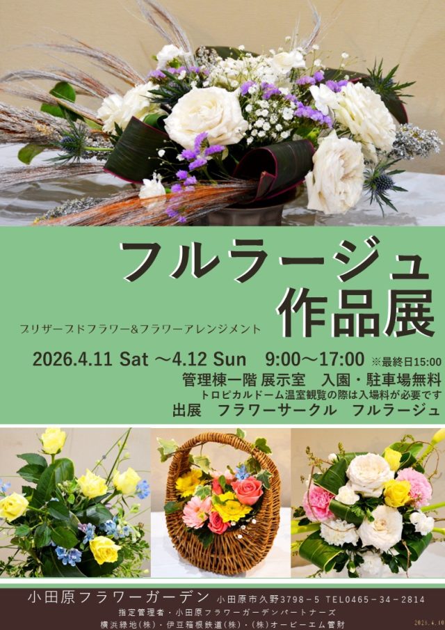 イベント情報 フルラージュ作品展 無料 フラワーアレンジメント、生け花、 プリザーブドフラワーのサークル「フルラージュ」による作品展です。 詳細データ 開催期間 4月11日(土曜日)~4月12日(日曜日) 時間 9:00~17:00※最終日15:00まで 場所 管理棟1階展示室 観覧料 無料 出展 フラワーサークル フルラージュ 一覧へもどる