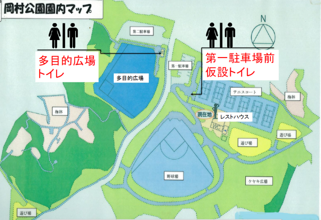 別紙「岡村公園園内マップ」(添付画像)に記載しております。