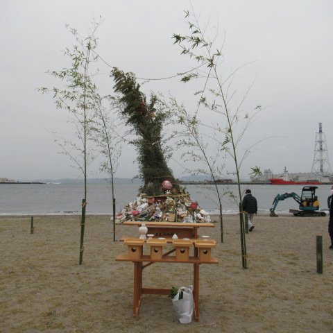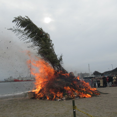 久里浜海岸でお焚き上げ・どんと焼きが行われました。