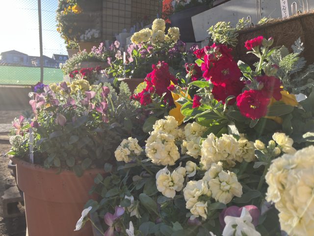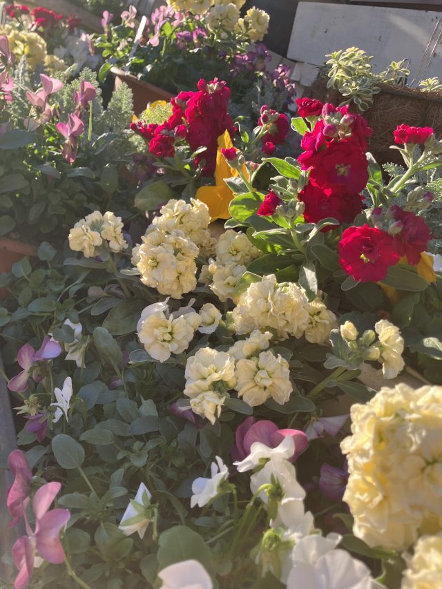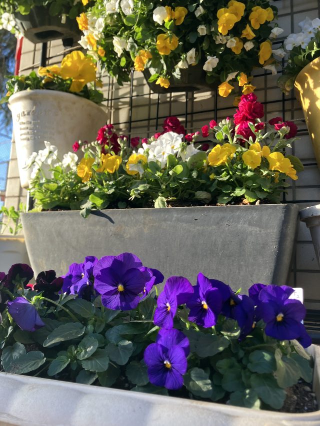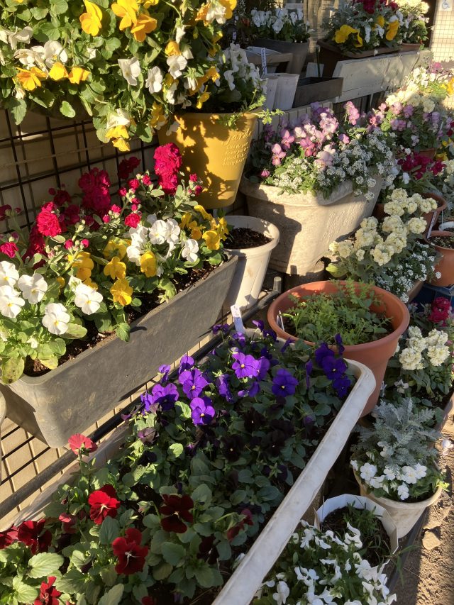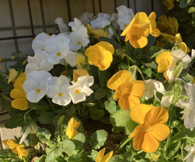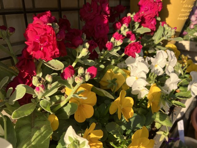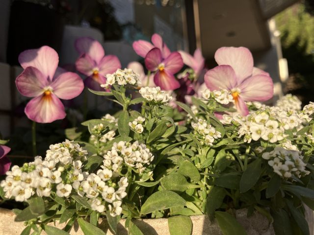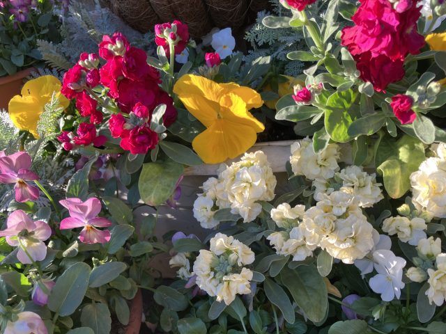 春にかけて次々に咲き続ける色とりどりのパンジーやビオラ、白い小さな花が集まったアリッサムなどで寄せ植えをしました🌼🎵🌼