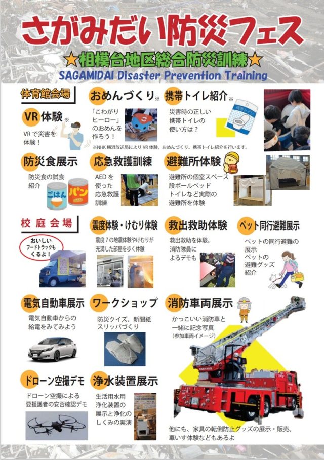 イベント情報 【出展】さがみだい防災フェス@相模台中学校【2025.11.16】 開催予定 無料 雨天決行 相模台まちづくりセンターが主催するイベントです。 今回は相模台公園も協力し、ワークショップも出展いたします。 開催日時11月16日(日曜日)入場無料 午前10時~午後2時 ※生存確率の整理券は午前9時30分から配布(定員になり次第配布終了) 会場 相模原市立相模台中学校 詳細データ 開催日 11月16日(日曜日) 関連情報 一覧へもどる