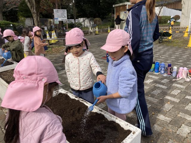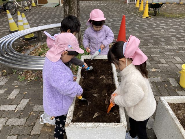 掘った穴の底に球根を置いたら、やさしく土をかぶせます。