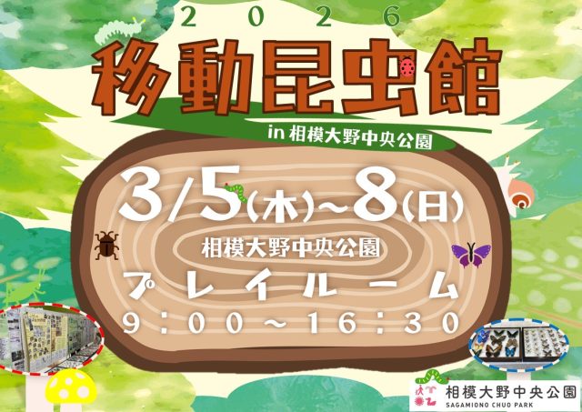 イベント情報 3/5(木)~3/8(日)移動昆虫館 in 相模大野中央公園 開催のお知らせ 開催予定 昆虫館が相模大野中央公園にやってくる! 相模大野中央公園プレイルームにて、 子どもたちの自由研究や昆虫愛好家の研究成果の展示の他、 土日限定で貴重な標本も展示されます。 昆虫のことを知ったら、もっと好きになる! 是非この機会に相模大野中央公園に遊びに来てね! ※入場無料。 標本と飼育セット販売は、7(土)、8(日)のみ。 詳細データ 開催期間 3月5日(木曜日)~3月8日(日曜日) 関連情報 移動昆虫館チラシ 一覧へもどる