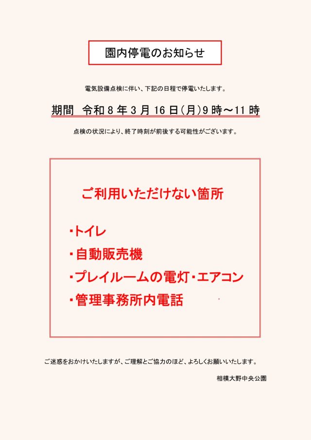 園内停電のお知らせ 3月16日(月)9時~11時