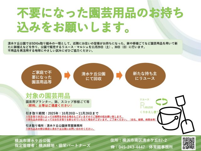 清水ケ丘公園ではSDGs取り組みの一環として鉢や移植ごて等の園芸用品を用いて新たに鉢植えなどを作り公園で展示、販売などを行う活動をしております。詳しくは添付の画像をご覧いただきますようお願いいたします。