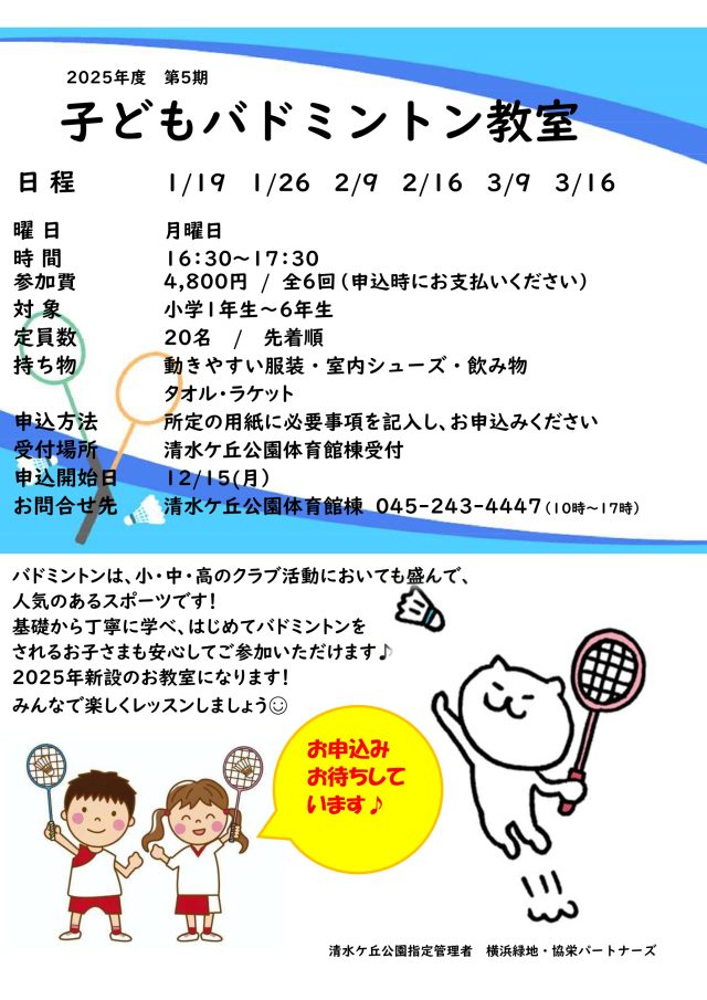 第5期子どもバドミントン教室の募集のご案内を致します。