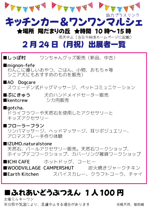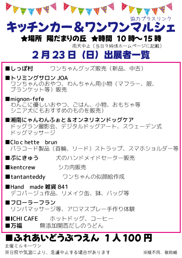 2月22日(土)、23日(日)開催のワンワンマルシェ&キッチンカーの出展者さんが決まりました。