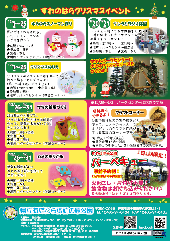 イベント情報 2025年12月イベント 開催予定 2025年最後のイベント情報です! 事前申し込みが必要なイベントが多くなっております。 開催情報をぜひご確認ください。ご参加お待ちしています♪ 詳細データ 開催期間 12月1日(月曜日)~12月31日(水曜日) 一覧へもどる