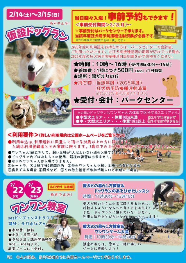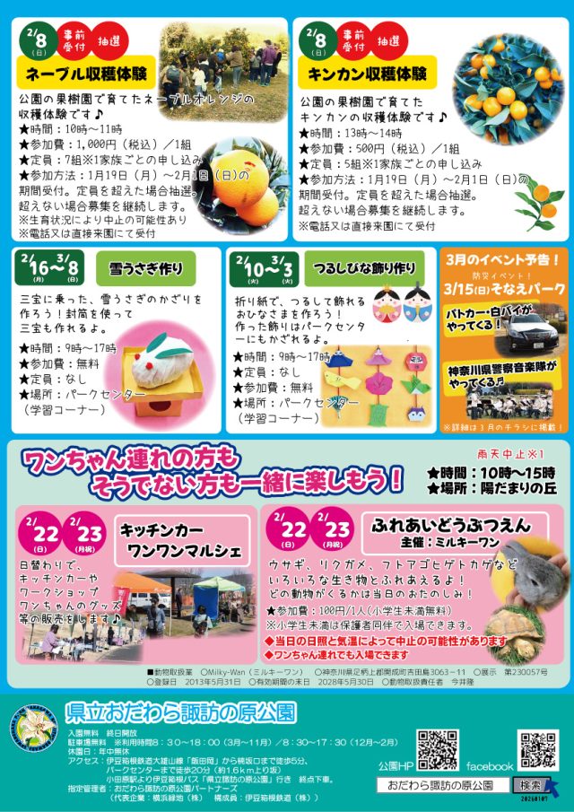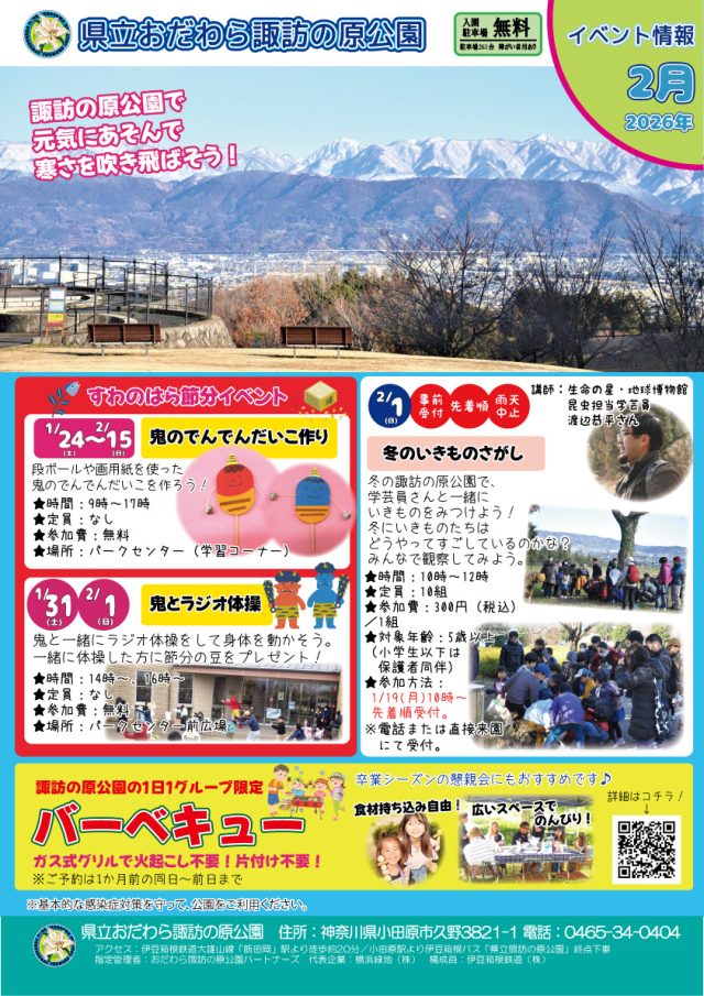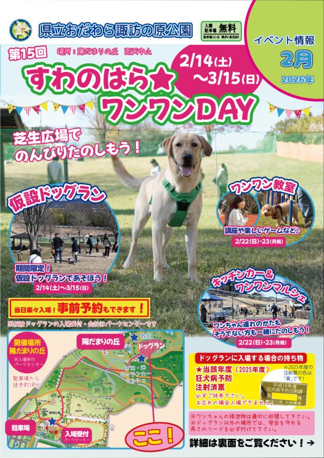 イベント情報 2026年2月イベント情報 開催予定 2026年2月のイベント情報です! 「すわのはらワンワンDAY」などのイベントを開催しますので、ぜひご参加ください♪ 詳細データ 開催期間 2月1日(日曜日)~2月28日(土曜日) 一覧へもどる
