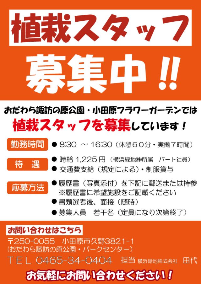 お知らせ 植栽スタッフ募集 配信日:2025年11月6日 おだわら諏訪の原公園では、現在一緒に働いていただける植栽スタッフを募集しています。主な仕事内容は、機械除草・工作物の制作や修繕、イベント補助などです。ご応募お待ちしております。 一覧へもどる