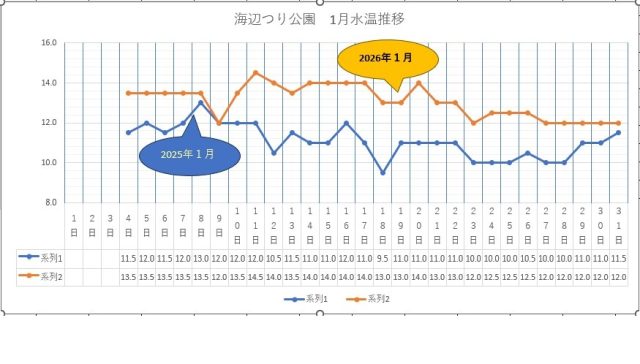 最高水温13℃(1/18) 最高水温14.5℃(1/13)