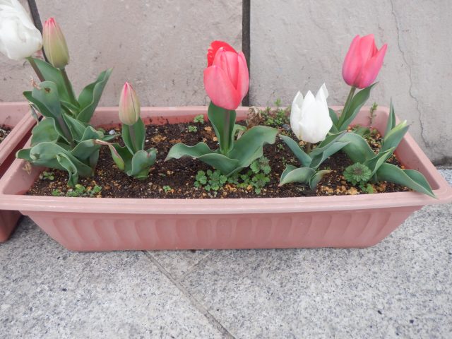 11月に幼稚園児が一生懸命に植え込んでくれた、円形花壇のチューリップが見ごろになりました。