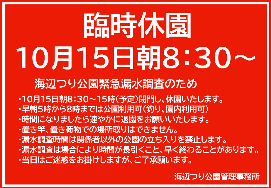 10/15(水)海辺つり公園では漏水が発生し、公園内の緊急漏水調査が入ります。(雨天予報時延期。前日夕方までに判断)