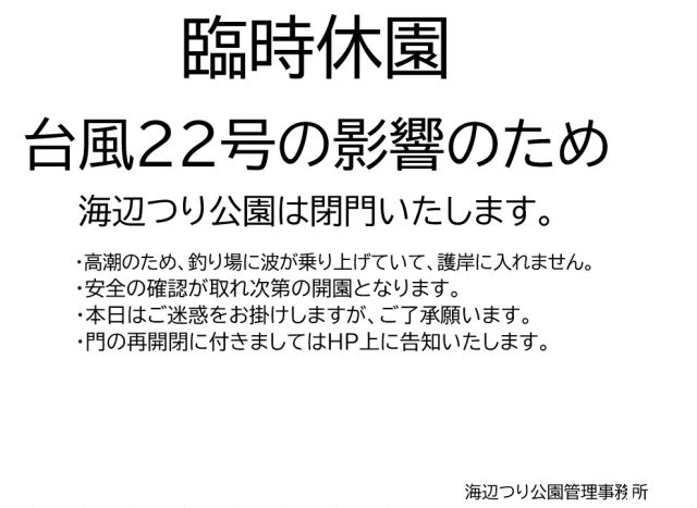 お知らせ 10月9日 休園のお知らせ 配信日:2025年10月9日 台風22号の影響により、釣りが出来る状態ではない為、当面の間、海辺つり公園は休園、閉門致します。 台風の状況を見ながら、開園、開門いたします。 一覧へもどる