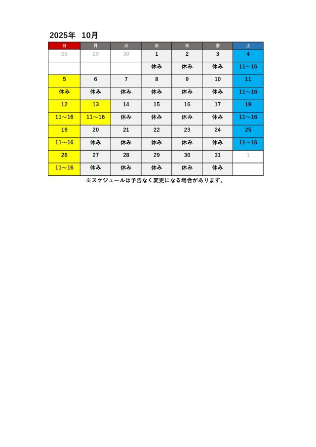 BMXパーク2025年10月のBMXパーク営業日は下記となります。