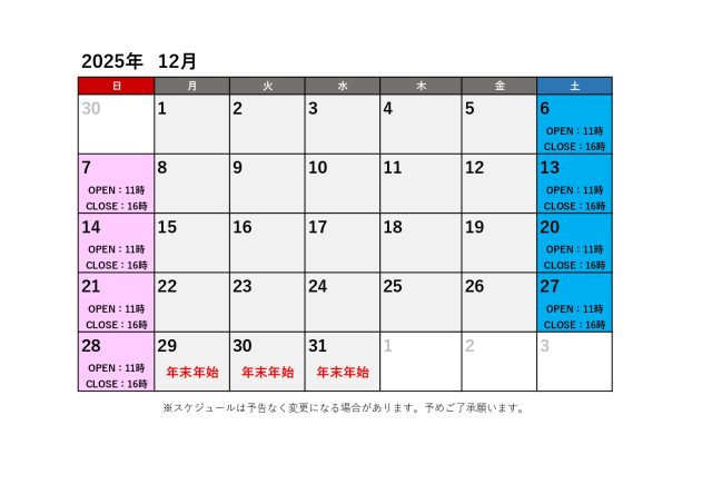 BMXパーク2025年12月・2026年1月のBMXパーク営業日は下記となります。